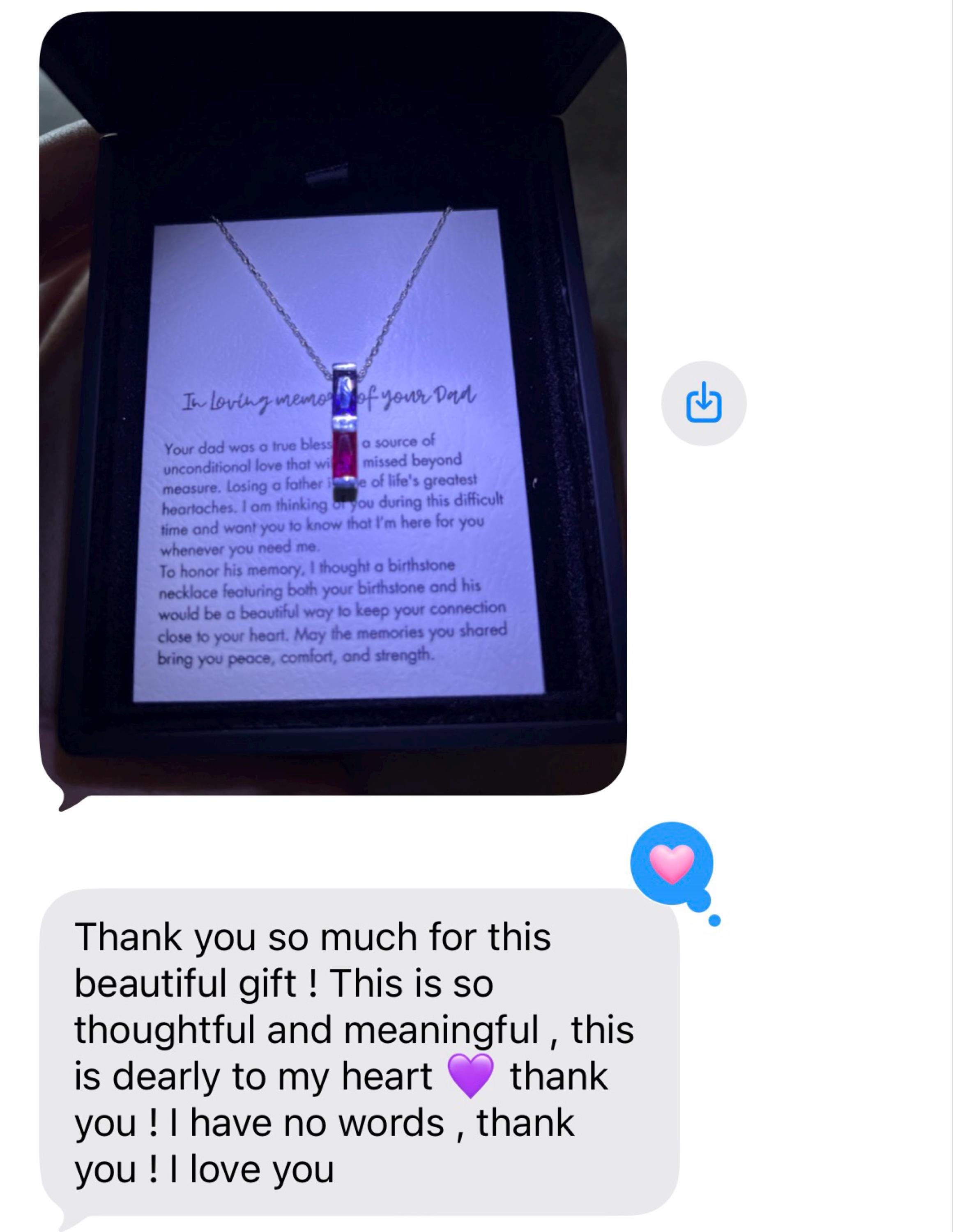 This special 2-stone birthstone necklace features stones representing the birth dates of the father and daughter. Each stone symbolizes the deep connection and cherished memories shared between them. This necklace serves as a heartfelt keepsake, reminding you of the love and bond that will always endure, even in times of loss. A perfect gift to honor a father's memory and the unique relationship that remains in your heart forever.
