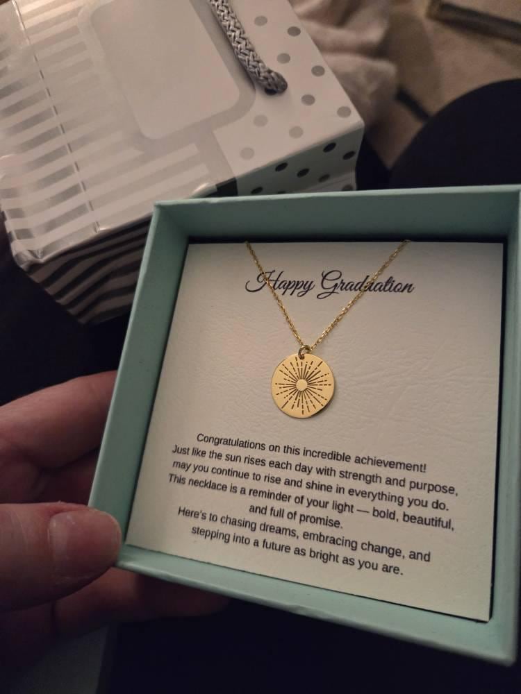 This elegant 925 Sterling Silver Sun Necklace is a meaningful way to honor her achievements and remind her to always chase the light. Whether she's finishing 5th grade, 8th grade, high school, or college, this necklace symbolizes growth, hope, and new beginnings.
