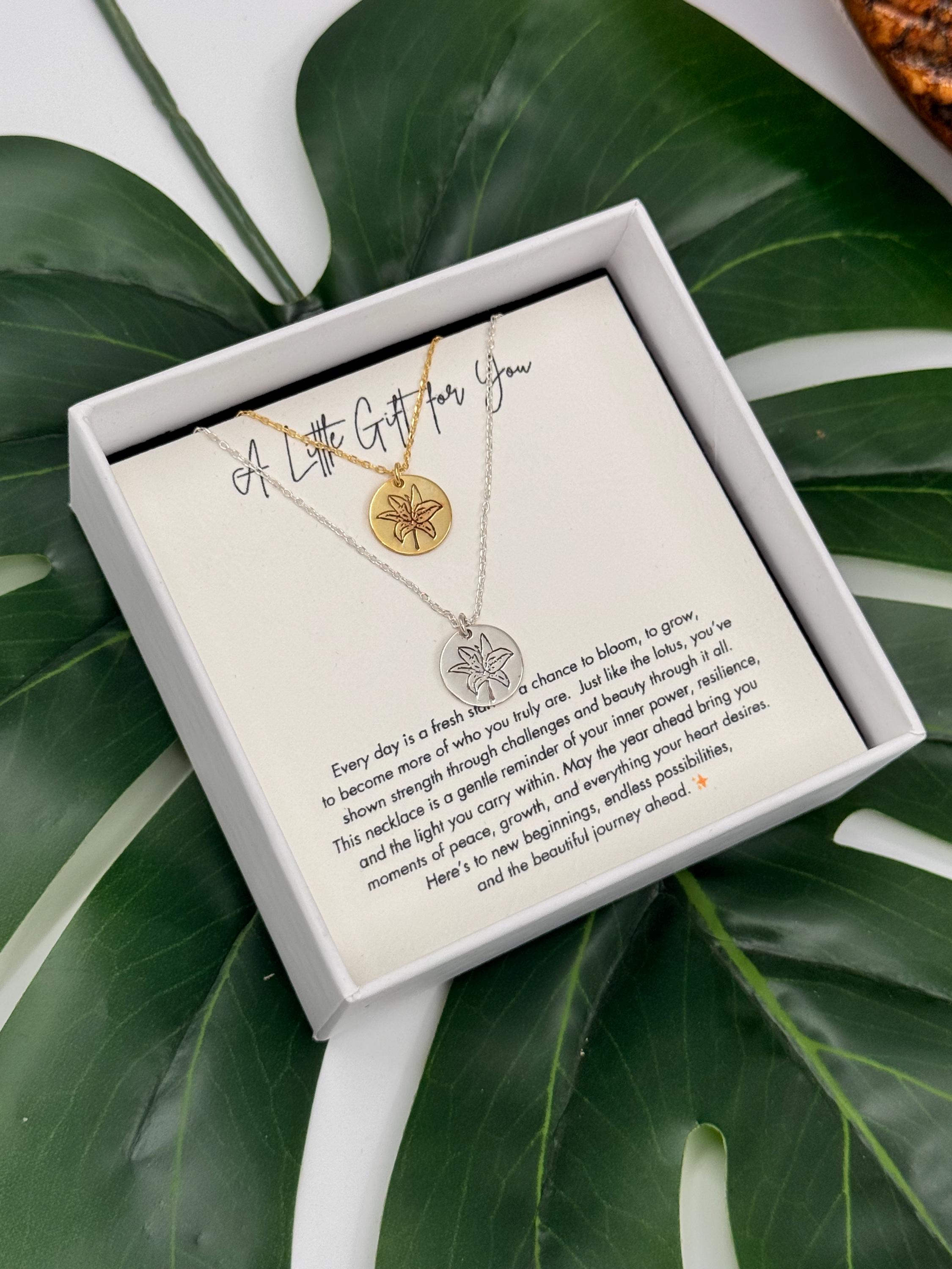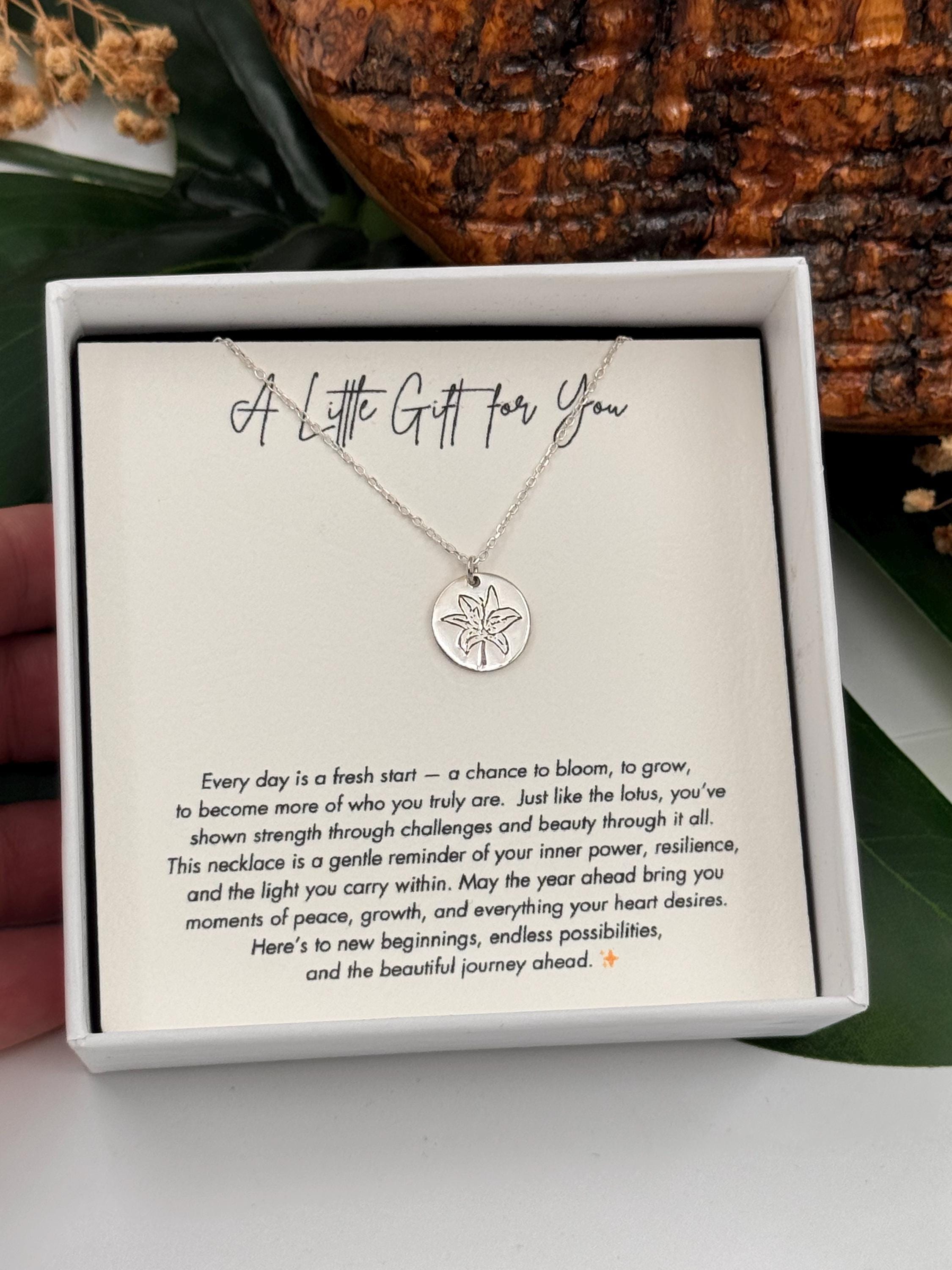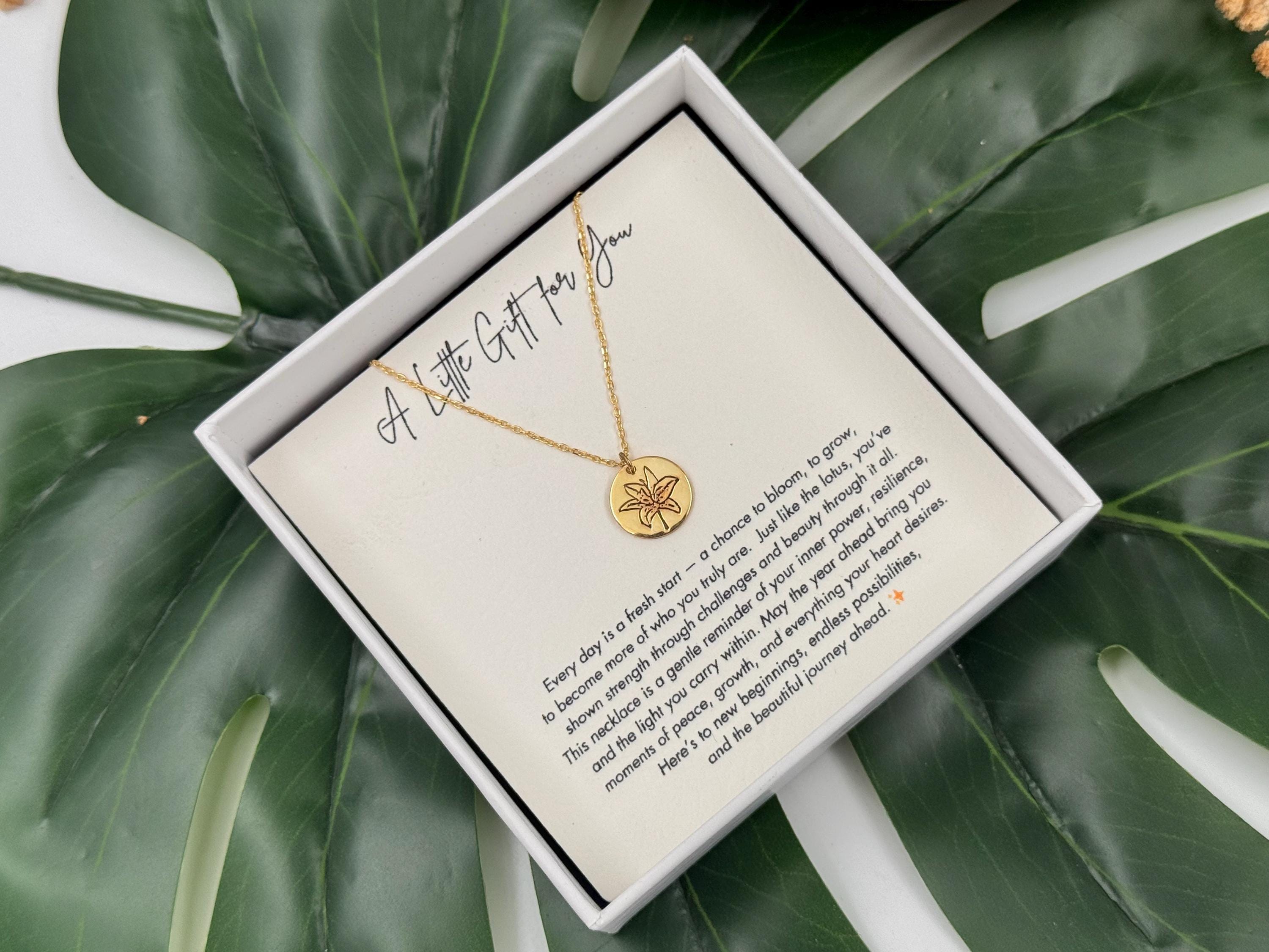 This delicate gold lotus necklace comes with a meaningful message card that reads:
